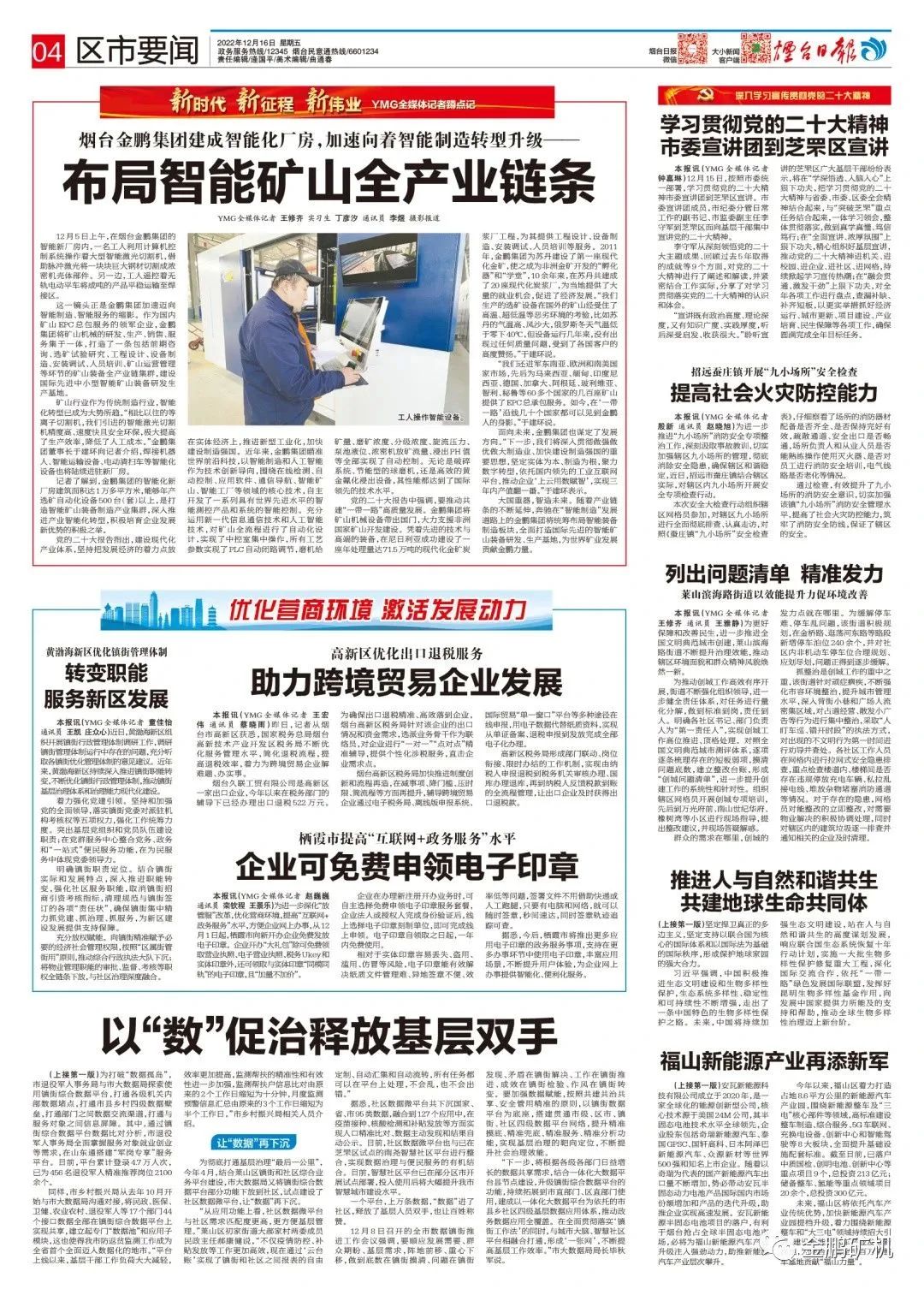 今天(12月16日),《煙臺(tái)日?qǐng)?bào)》以《新時(shí)代 新征程 新偉業(yè)|煙臺(tái)金鵬集團(tuán)布局智能礦山全產(chǎn)業(yè)鏈條》為題,大篇幅報(bào)道金鵬礦機(jī)緊緊抓住“一帶一路”發(fā)展機(jī)遇,圍繞“大國(guó)重器,智造未來(lái)”,統(tǒng)籌布局智能裝備制造板塊,實(shí)現(xiàn)高質(zhì)量快速發(fā)展。